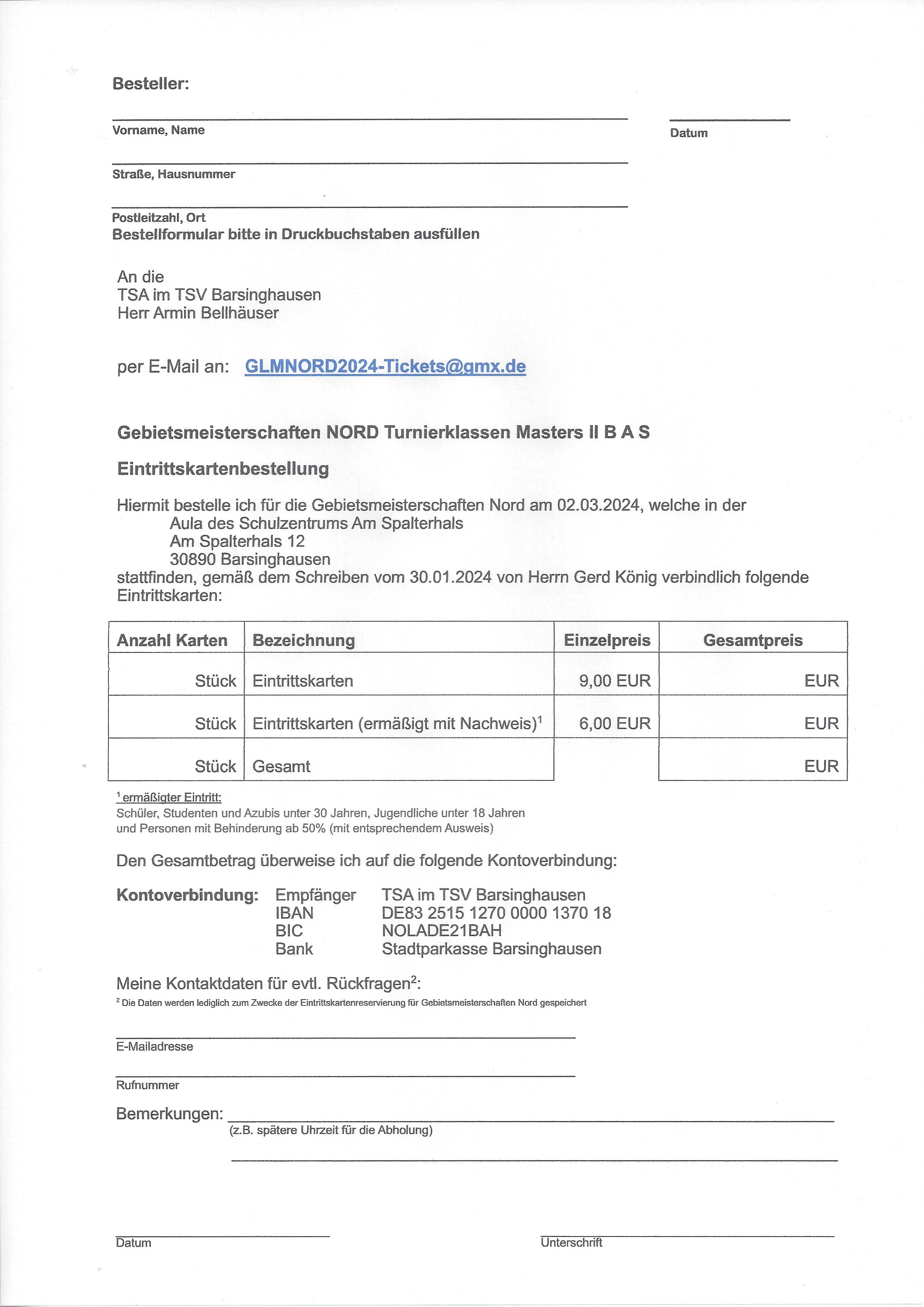Nachdem sich die fünf norddeutschen Landesverbände Niedersachsen, Schleswig-Holstein, Hamburg, Bremen und Mecklenburg-Vorpommern im "Nordverbund" zusammengeschlossen haben und gemeinsame Landesmeisterschaften (GLM) anbieten, wurden die GLM 2024 der Turniere Masters II B, II A und II S in den Standardtänzen an unsere TSA im TSV Barsinghausen vergeben.