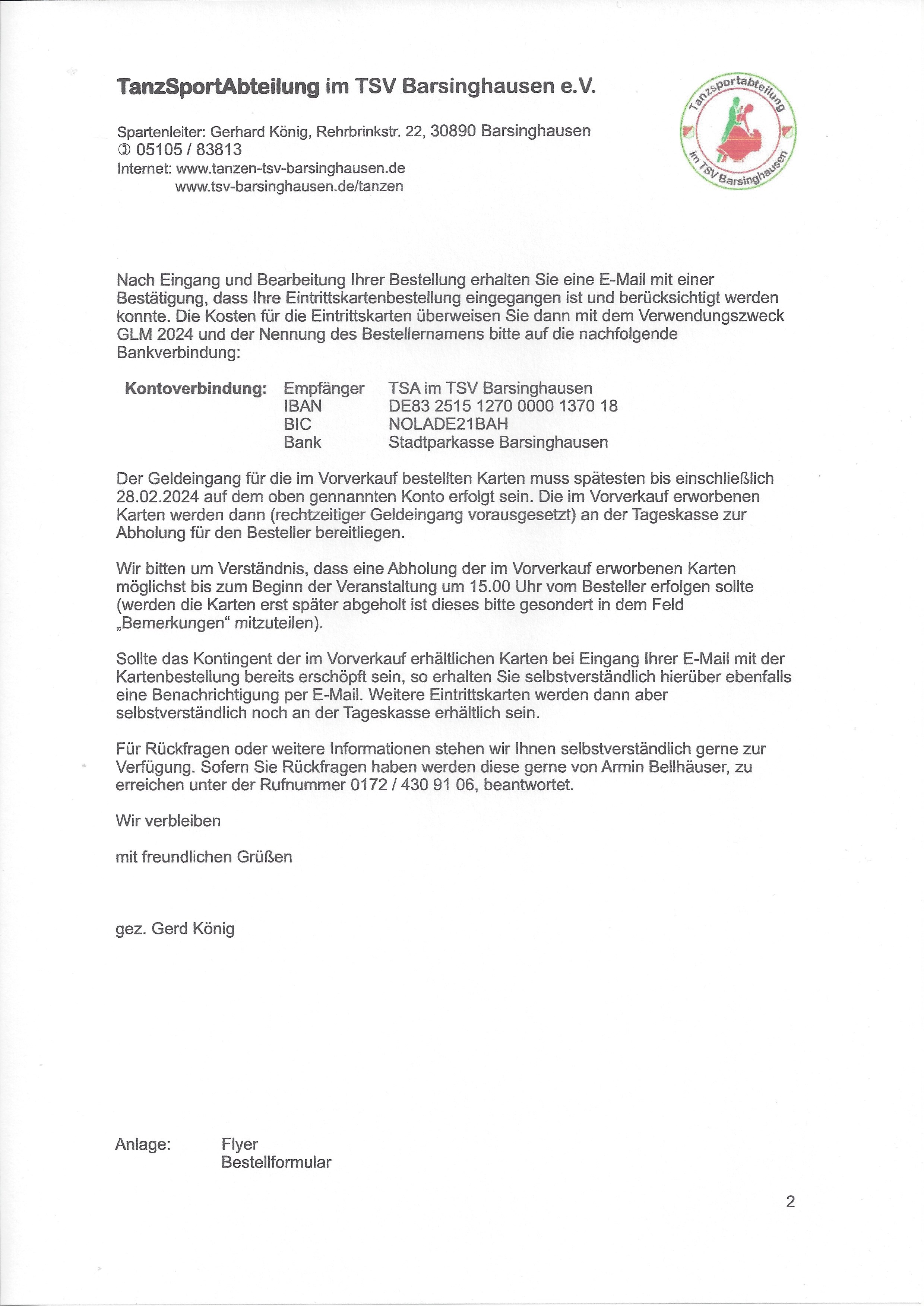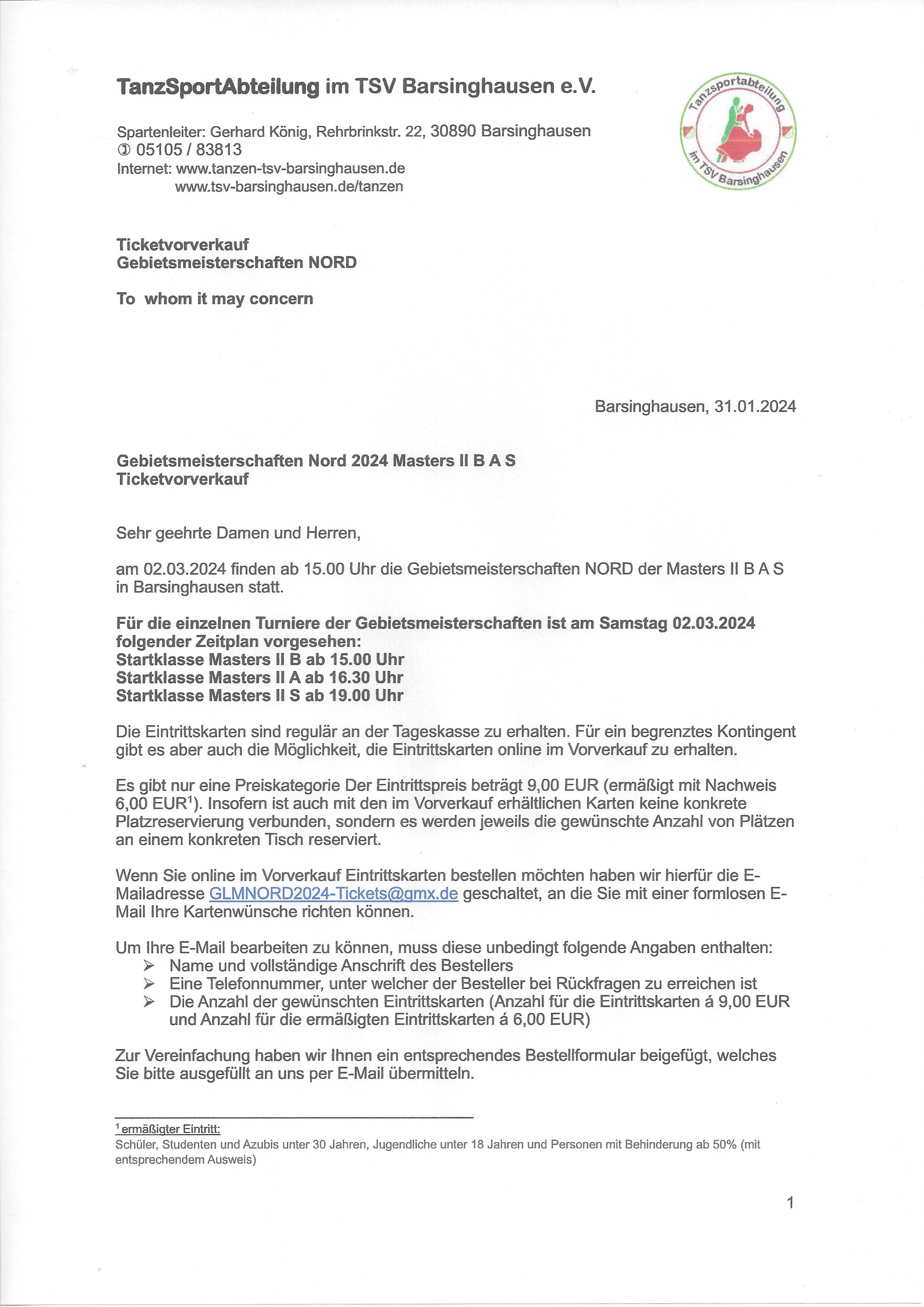 Nachdem sich die fünf norddeutschen Landesverbände Niedersachsen, Schleswig-Holstein, Hamburg, Bremen und Mecklenburg-Vorpommern im "Nordverbund" zusammengeschlossen haben und gemeinsame Landesmeisterschaften (GLM) anbieten, wurden die GLM 2024 der Turniere Masters II B, II A und II S in den Standardtänzen an unsere TSA im TSV Barsinghausen vergeben.