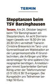 Stepp-Tanz-Kurs im TSV Barsinghausen (Artikel in der HAZ (SPORT) vom 10.10.2019