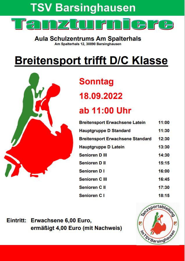 Der Vorstand der TanzSportAbteilung (TSA) im TSV Barsinghausen freut sich, am Tag nach den Landesmeisterschaften der SEN III A, III B und III S, den Tanzpaaren der Leistungsklassen D und C das bewährte Parkett zur Präsentation ihrer Tanzkunst anzubieten. Wir wollen aber nicht vergessen, welches die Plattform des Turniertanzes ist. Das ist der Breitensport. Und da das Motto unserer Veranstaltung am Sonntag lautet: "Breitensport trifft D/C Klasse", darf dieser Breitensport nicht fehlen. Für den Erwachsenbereich im Standard- und im Lateintanz finden zu Beginn des Events die entsprechenden Breitensport-Turniere statt.