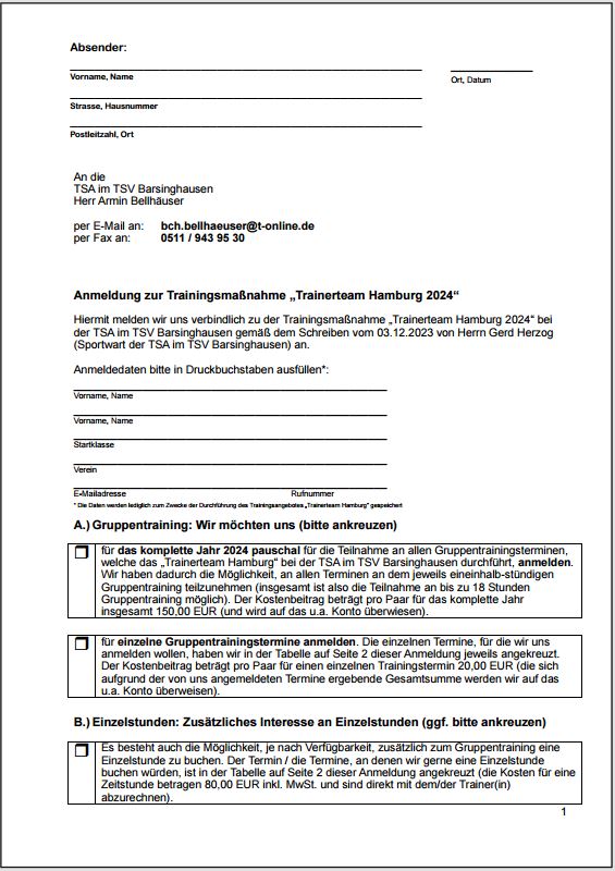 Die nachfolgende Anmeldung zur Trainermaßnahme "Trainerteam Hamburg 2024" kann mit dem LINK "Anmeldung" direkt heruntergeladen werden.